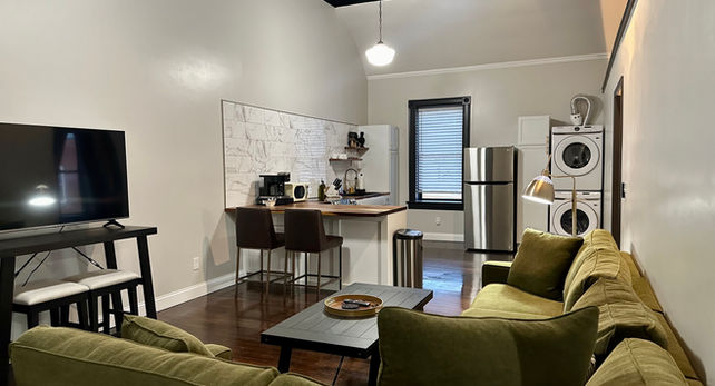 An apartment-style loft in the original Mercantile Hall—pressed-tin ceilings, warm historic character, and modern comforts for an easy stay.